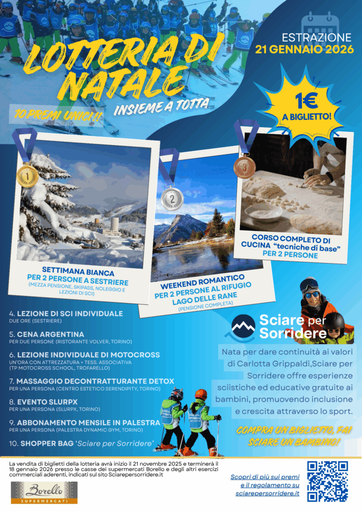 La Lotteria di Natale è un’iniziativa benefica promossa da Sciare per Sorridere per sostenere le attività rivolte a bambini e ragazzi che vivono situazioni di svantaggio economico o sociale.